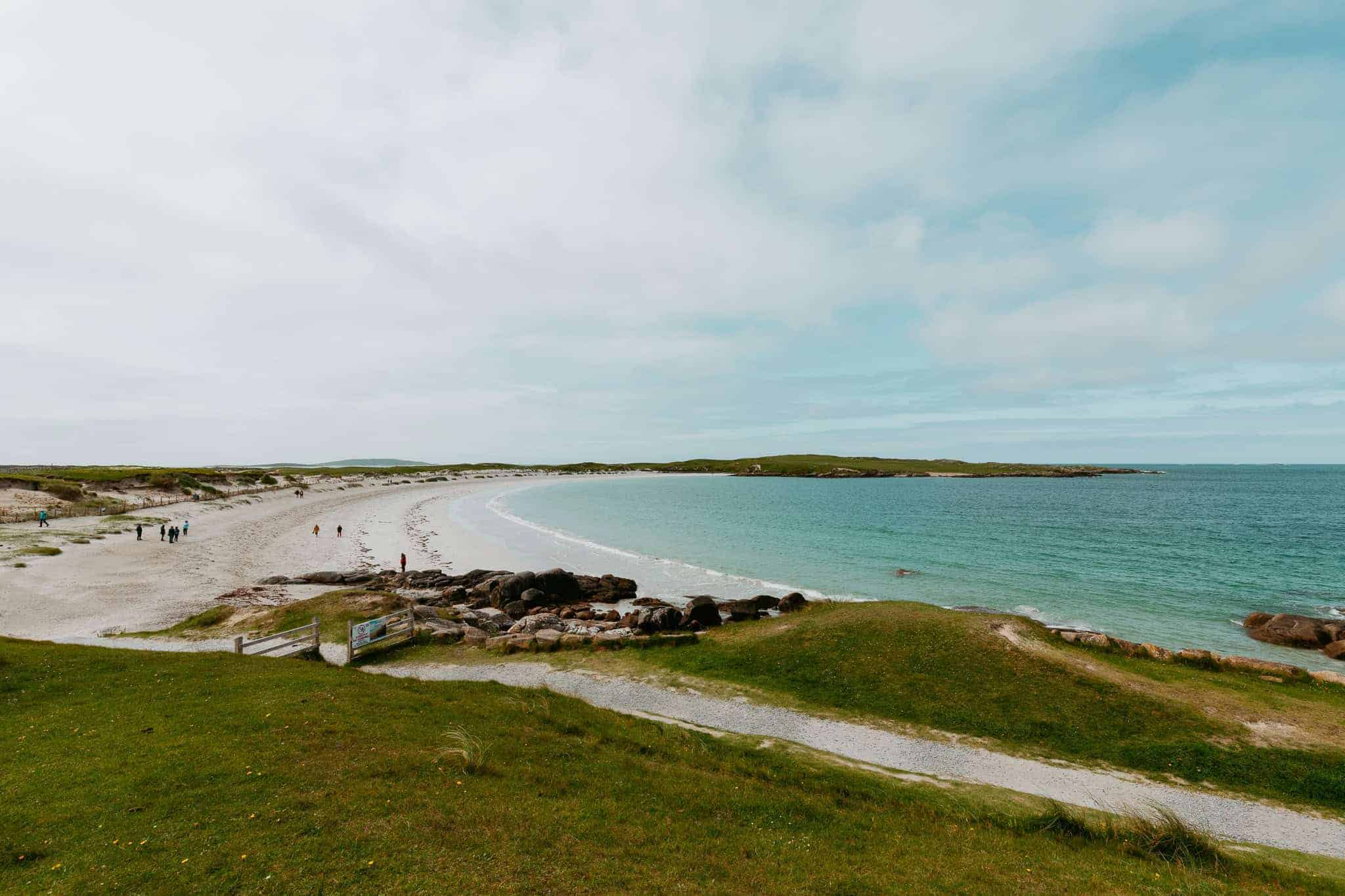 Dog’s Bay, just outside Roundstone in Connemara, is a stunning crescent-shaped beach unlike anywhere else in Ireland. Made entirely from crushed seashells rather than rock, the sand here is bright white and soft, perfectly contrasting the turquoise water and green hills behind. On a sunny day, it genuinely looks tropical.